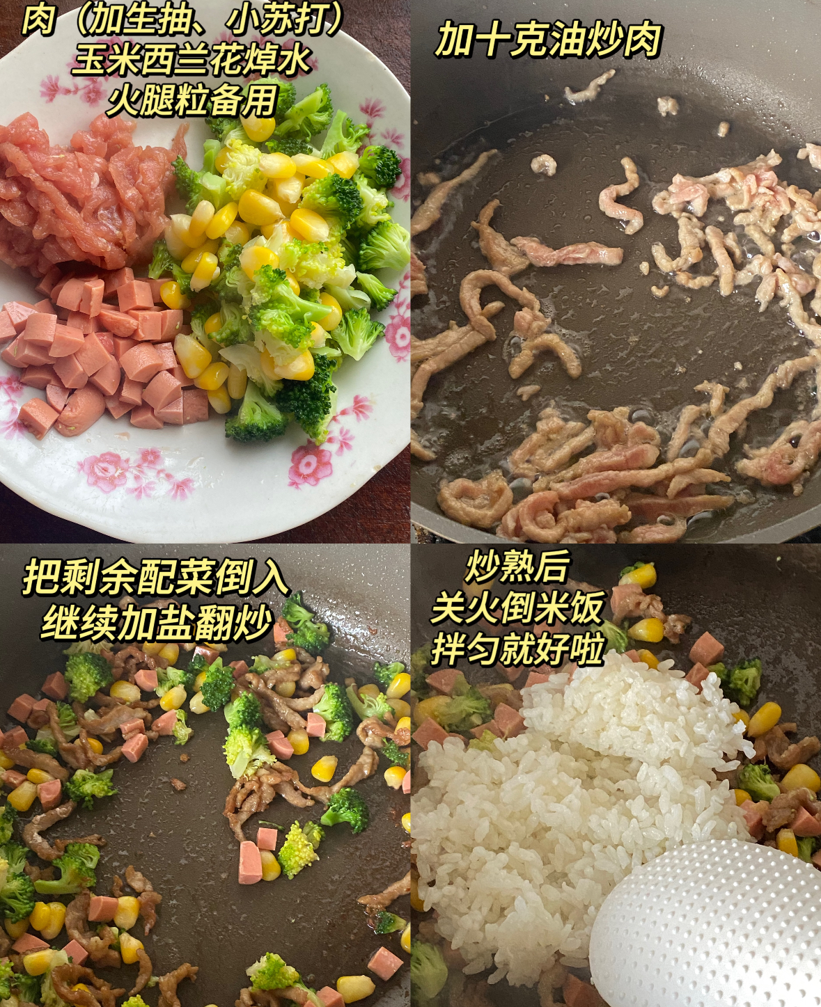当锅中的食材都已成熟、香气融合之时,便是米饭登场的最佳时机。将事先备好的、最好是隔夜冷藏的米饭倒入锅中。隔夜米饭水分较少,颗粒分明,是做出松散可口炒饭的不二法门。关掉火源,利用锅与食材的余温来拌炒米饭,可以有效防止米饭因持续加热而变得粘软。用铲子耐心地将米饭与所有配菜拌匀,让米粒均匀地沾上油脂与锅气,并和五彩的食材充分混合。最后,再将之前炒好的肉片倒回锅中,一起轻轻翻拌均匀。一道色泽诱人、营养丰富的西兰花火腿肠玉米炒肉饭便大功告成。