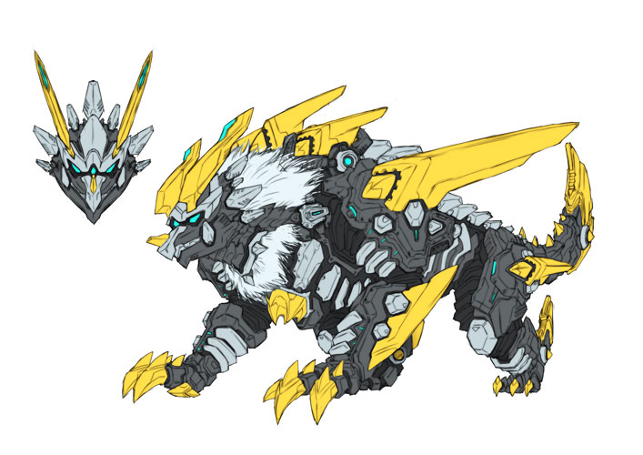 【后藤】最初因为(它对应)白虎的形象,所以是按野兽系的脸来考虑的,但总觉得不够有趣。于是,就把它的设计原型改成了三角龙。