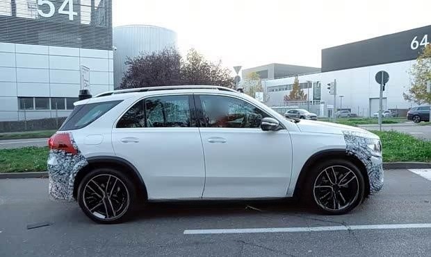 转到车身侧面,可以明显看到后门长度比前门更长。作为对比,现款奔驰GLE的前后车门长度接近相等,由此可以确认这是国产长轴距版本。预计新车轴距将突破3米,C柱区域也进行了加宽处理,这将为七座版车型的第三排带来更宽敞的乘坐空间。