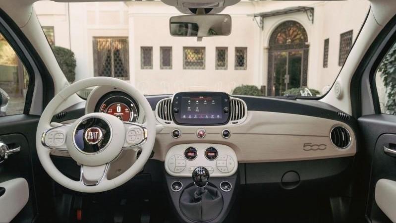 外观方面,为了向1957年上市的初代菲亚特500车型致敬,全新菲亚特500C Collezione 1957特别版车身换上专属Gelato White/Lugiada Green双色涂装,同时搭配上象牙白色软顶篷,车外配备白色镀铬车外后视镜盖以及银色拉线,同时配备全新16英寸白色铝合金轮圈,两侧后窗还贴上500 Silhouette 字样贴花,营造成不错的复古感。除此之外,新车还在细节上采用了镀铬饰条进行点缀,并且配备LED 雾灯,看起也更有时尚感。