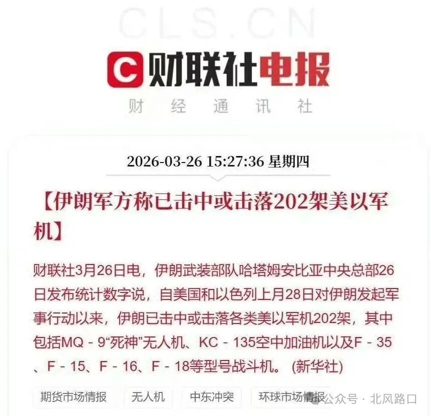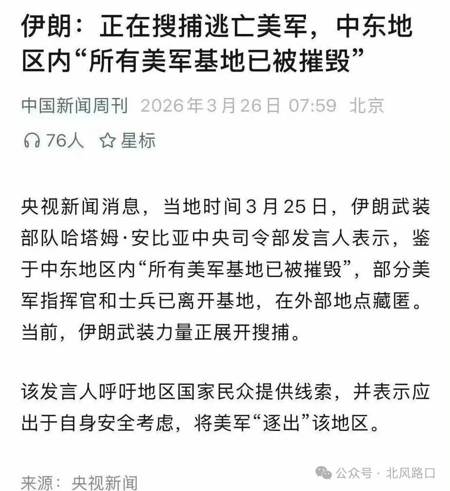 3月25日-26日,伊朗武装部队哈塔姆·安比亚中央司令部发言人表示,中东地区内“所有美军基地已被摧毁’,伊朗正在搜捕逃亡的美军,而且已击中或击落202架美以军机,包括无人机、加油机、以及F-35、F-15、F-16、F-18等型号战斗机。