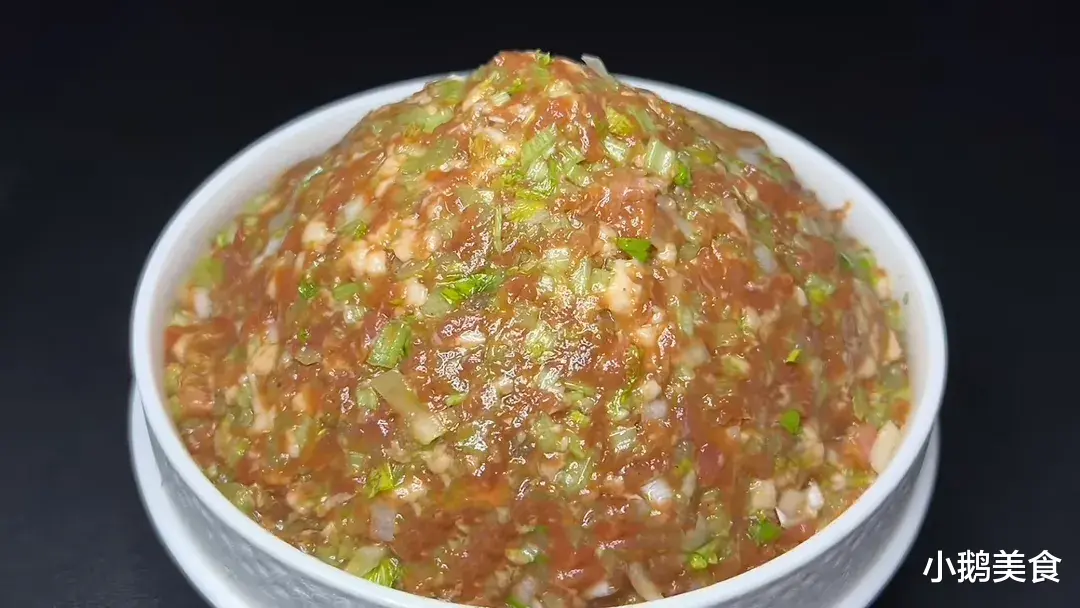 第五步,一定要等准备包饺子的时候,再把菜放入馅里,这样饺子馅才不会出汤。充分搅拌均匀,芹菜猪肉馅就调好了。