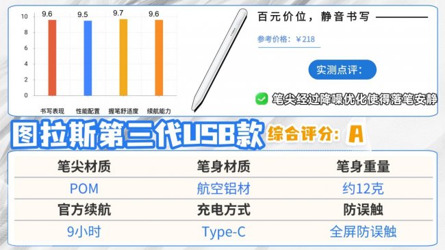 这款电容笔采用航空级铝合金材质打造,手感细腻且质感上乘,同时整支笔的重量控制在约12克左右,轻巧便携,即便长时间书写或绘画,也不会给手腕造成明显压力,使用体验舒适自然。在书写性能方面表现同样出色,笔尖使用高耐磨POM材质,书写顺滑且精准,能够保证线条的稳定与清晰。配合防误触功能设计,手掌在屏幕上自然放置时不会影响操作,无需刻意悬空,既提高了书写舒适度,也保证了精确度。充电体验也非常便利,配备了Type-C接口并支持快速充电,大约30分钟即可充满电,满电状态下可连续使用约9小时。唯一需要注意的是,与市面上多数平价电容笔相比,这款产品的售价略高。