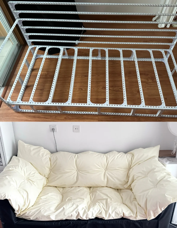 固定好了之后,准备好布料,把布料平铺在角钢定制的沙发上面,在准备一些软一些的靠垫,这不就是一个好看又舒服的沙发吗?