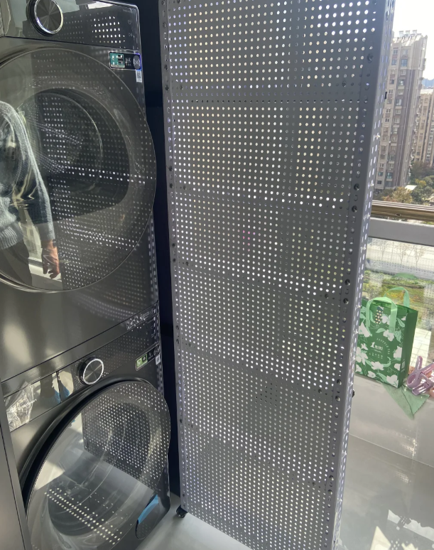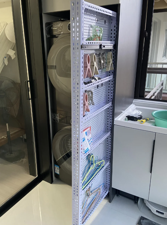 最后就准备了一些角钢,搭配着金属洞洞板,固定好,把它放在洗衣机旁边的缝隙里面刚刚好,角钢下面固定几个轮子,平时拉着很顺畅。
