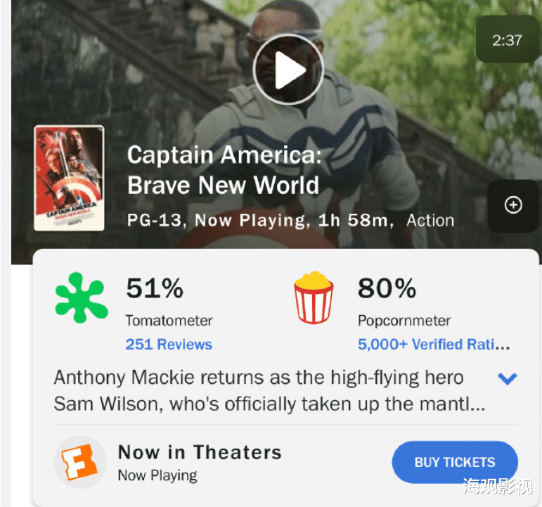 据猫眼数据显示,截至2月18日,《美队4》在中国上映后的票房仅为8184.2万元人民币,与一众春节档电影相比,这个成绩可谓“惨淡”。而在北美,《好莱坞报道者》指出,《美队4》的开画票房仅为4000万美元,糟糕的口碑更是让后续票房走势雪上加霜。英国《泰晤士报》更是直言不讳地批评:“影片混乱而空洞,漫威宇宙已经没有故事可以迭代了。”