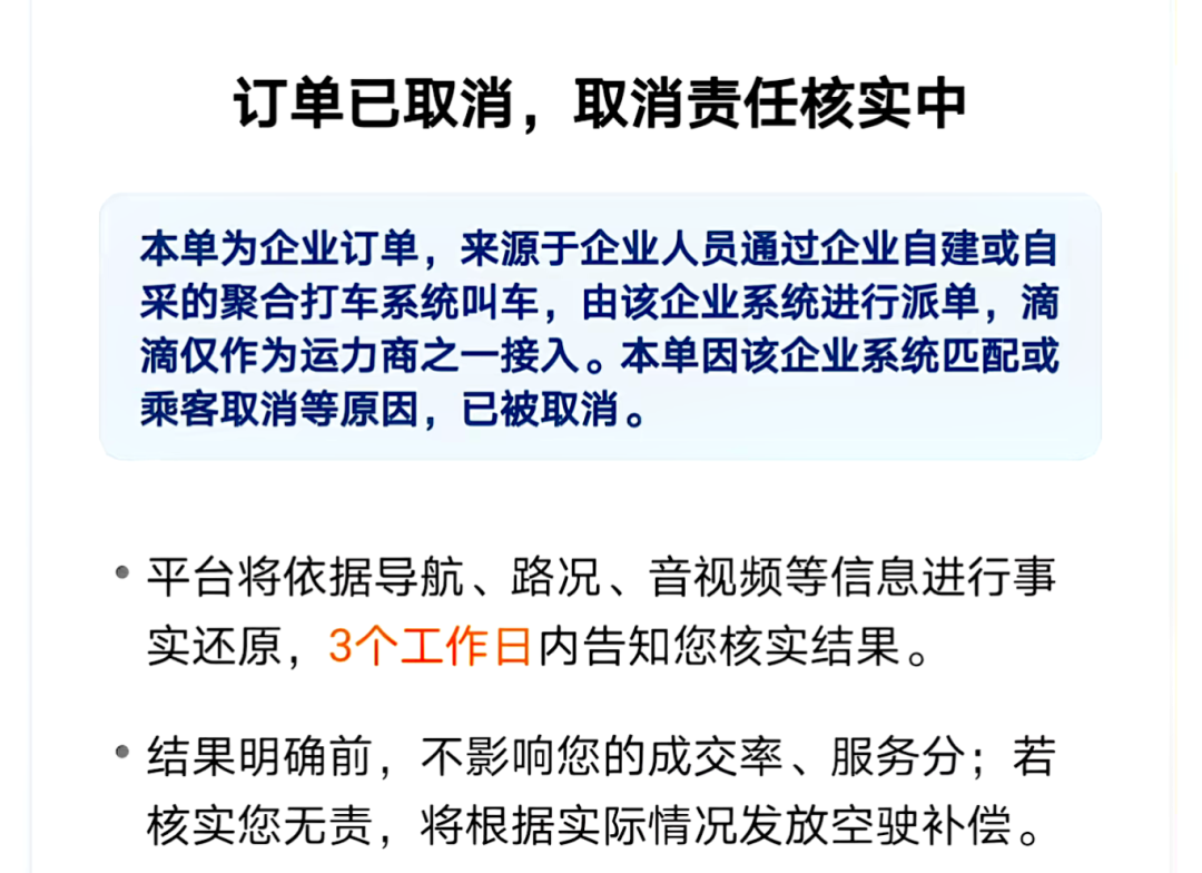 针对这个场景的取消,滴滴发布通知说,“取消责任核实中”——结果明确前不会影响司机的成交率和服务分,经核实司机无责的,将根据实际情况发放空驶补偿。