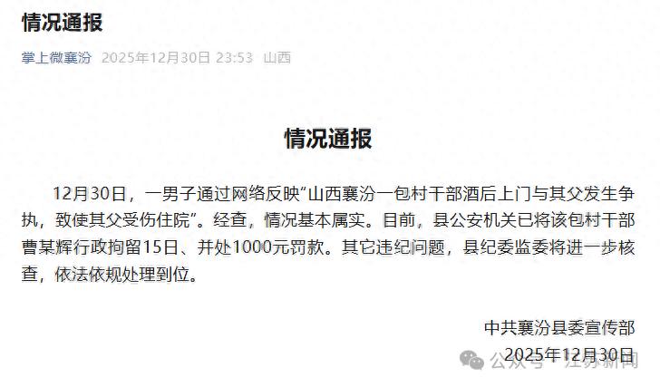 12月30日,一男子通过网络反映“山西襄汾一包村干部酒后上门与其父发生争执,致使其父受伤住院”。经查,情况基本属实。目前,县公安机关已将该包村干部曹某辉行政拘留15日、并处1000元罚款。其它违纪问题,县纪委监委将进一步核查,依法依规处理到位。