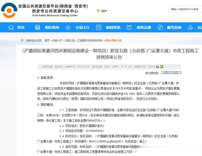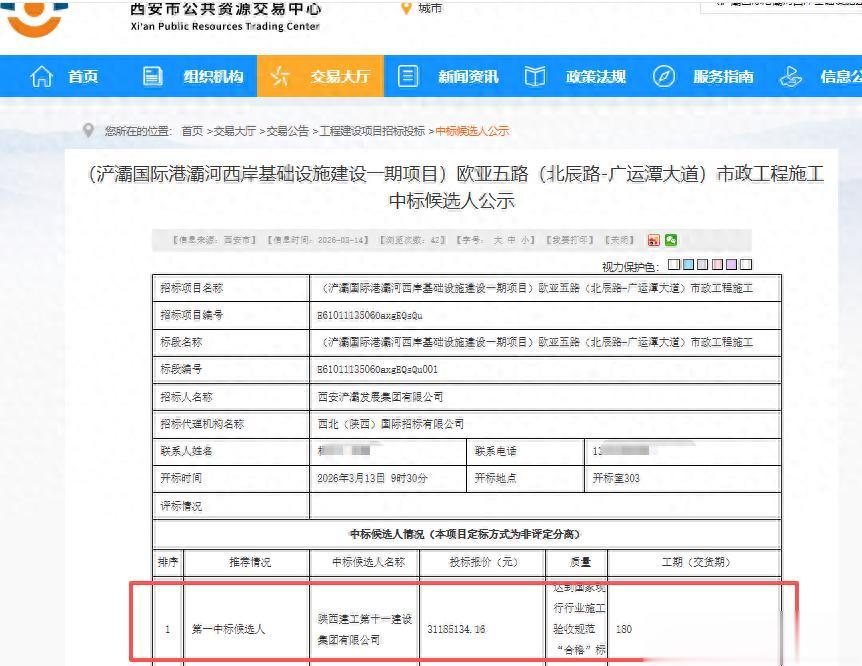 3月14日,西安公共资源交易中心发布《(浐灞国际港灞河西岸基础设施建设一期项目)欧亚五路(北辰路-广运潭大道)市政工程施工中标候选人公示》,内容显示: