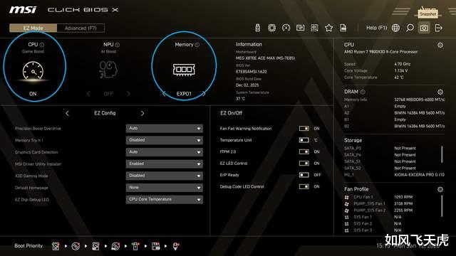 重启电脑进入到主板的BIOS界面,微星的CLICK BIOS X非常具有特色,界面的颜色同主板风格一致。在默认简易模式画面可以看见系统的一些状态,还有一些简单的一键设置。