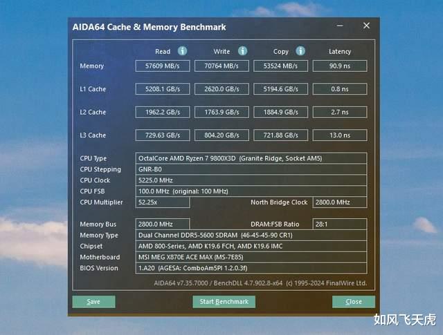 AIDA64 内存测试,读取57609MB/s,写入70764MB/s,复制53524MB/s,延迟90.9ns。