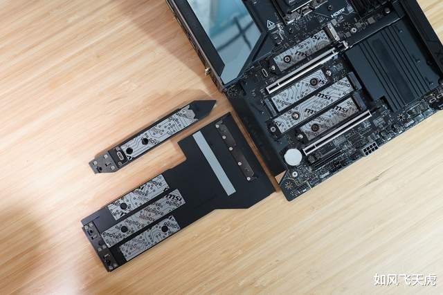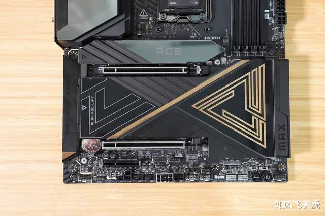 加上刚才在背板看见的M.2插槽,这样这款主板一共带有了5个M.2插槽。其中第一个好第二个插槽来自CPU直连,支持PCIe 5.0x4,其余三个来自芯片组,支持PCIe 4.0x4。硬盘也采用了易拆卸设计,安装M.2硬盘轻松方便。