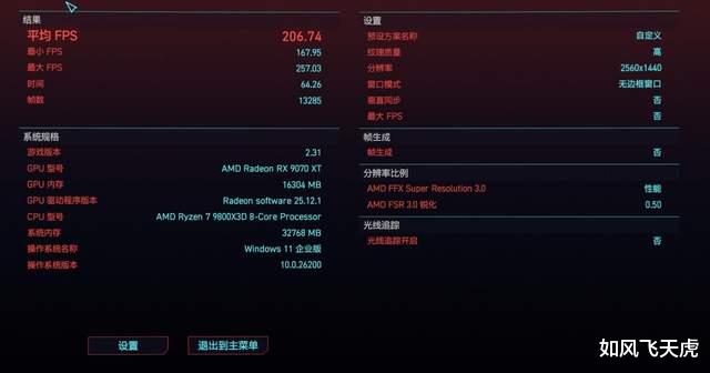 再来看看游戏的表现,赛博朋克2077,在2K分辨率超级画质、启用FSR3的配置下,平均FPS 206.74,最小FPS167.95,最大FPS 257.03。平均FPS基本不变,最小FPS略有提升。