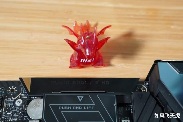将主板接好电源,按动启动按钮,我们看到一体式IO面板上面呈现了彩色的龙形标记,这里有隐藏式的RGB灯效,上电就显示出来了。同时看到,M.2装甲上的ACE字样,同样也有RGB灯效呈现。