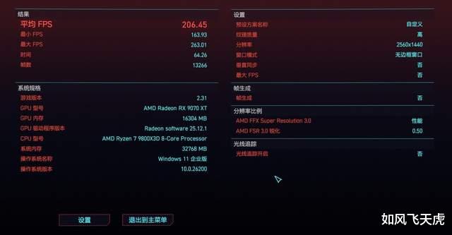 游戏测试,首先是赛博朋克2077,在2K分辨率超级画质、启用FSR3的配置下,平均FPS 206.45,最小FPS163.93,最大FPS263.01。