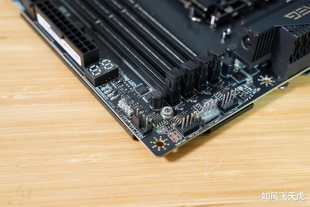 这款主板具有丰富和独特的各种接口设计,例如仅在内存条的周边,就可以看到有1个CPU风扇、1个水泵/风扇、2个系统风扇接口,足够丰富。水泵/风扇接口可以自识别,有独特的灰色外观,此外还有一个ARGB 彩光接口。在这个附近还可以看到一个双位数码管显示,可以显示主板状态/温度,四个LED状态灯显示(BOOT / VGA / DRAM / CPU)。