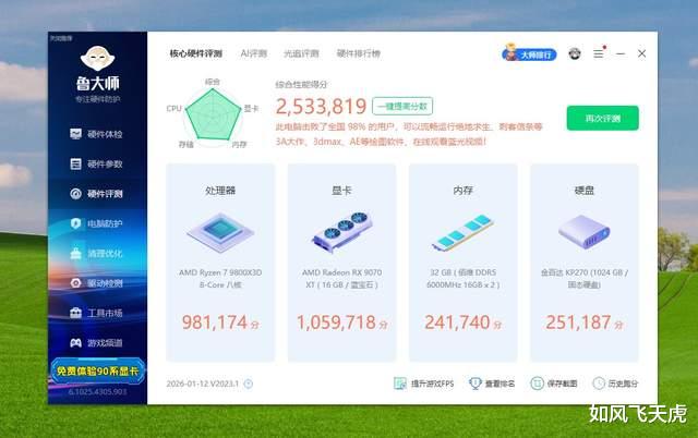 喜闻乐见的鲁大师测试,总分253.3819万分,其中CPU处理器是98.1174万,显卡是105.9718万,内存是24.174万,硬盘是25.1187万。