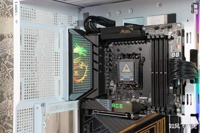 五 总的感受这款微星MEG X870E ACE MAX战神主板不仅是一块主板,更像是一件值得收藏的科技艺术品。从开箱那一刻起,提手式包装的厚重感与彩色主视觉设计就传递出强烈的高级感,金色龙形徽记与主板轮廓图相得益彰,让人瞬间感受到“旗舰”的分量。上电后,一体式IO面板的龙形RGB灯效悄然亮起,M.2装甲上的“ACE”字样也随光绽放,隔着空气都能感受到它所带来的不凡感觉。