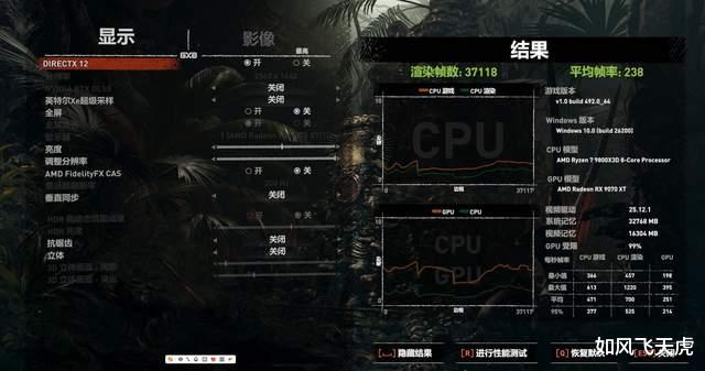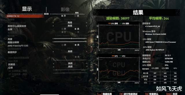 古墓丽影.暗影,2K分辨率最高画质下,CPU游戏平均458帧,CPU渲染平均687帧,GPU平均250帧。