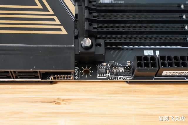 通过上图还可以看到有3个PCI-E插槽,上面2个均为PCI-E x16,并且带有金属加固,下面一个是PCI-E x4。第一条支持PCIe 5.0 x16,第二条支持PCIe 5.0 x8,第三条支持PCIe 4.0 x4。