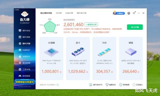鲁大师跑分测试,总分260.1406万分,其中CPU处理器是100.0801万,显卡是102.9662万,内存是30.4357万,硬盘是26.6640万。CPU和内存的分数大幅提升。
