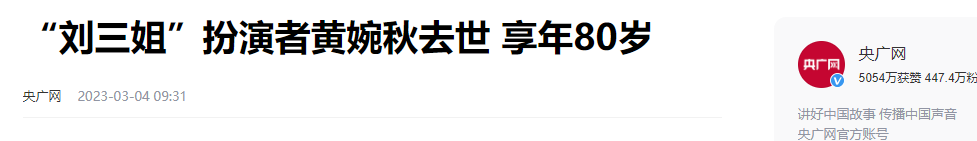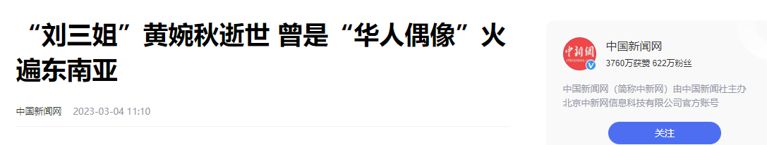 中国新闻网:“刘三姐”黄婉秋逝世 曾是“华人偶像”火遍东南亚