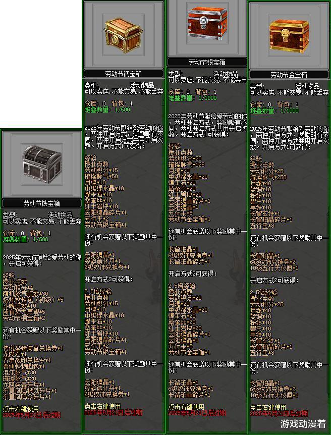 此外。大侠在“游戏活动大使”处还可领取一本【劳动手册】,每日会发布的随机任务,完成任务可获得一定数量的【劳动节铁宝箱】,以及更高等级的宝箱,快快开启幸运宝箱收获好礼吧。