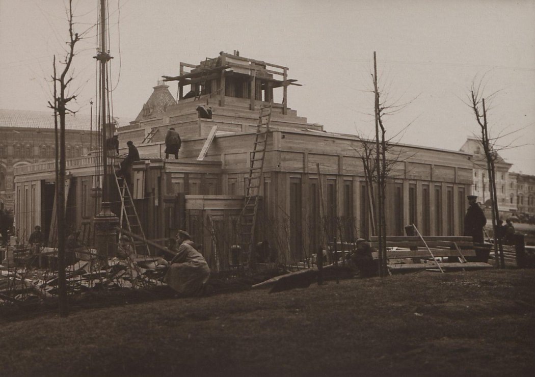 列宁葬礼当天,克里姆林宫元老院塔楼前建起了一座临时木质陵墓——而这座陵墓,后来被证实是三座陵寝中的第一座。陵墓选址于19世纪10年代被填平的阿列维佐夫壕沟旧址。葬礼次日,设计建造这座陵墓的任务便落到了阿列克谢·维克托罗维奇·休谢夫肩上——这位建筑师无论在革命前还是革命后,都被视作同时代最顶尖的建筑大师之一。休谢夫在回忆受命设计陵墓的情景时这样说道: