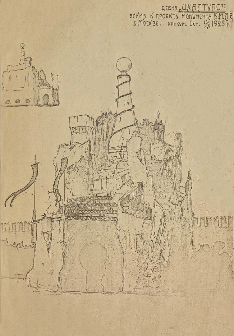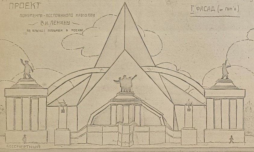 1925年1月,恰逢列宁逝世一周年纪念日前两周,《消息报》刊登了苏联中央执行委员会主席团的决议——《关于莫斯科红场弗拉基米尔·伊里奇·列宁永久性纪念碑暨陵墓设计方案首轮竞赛的公告》。本次竞赛面向全民开放,“所有有思考能力的公民”均可参与,无论其是否具备专业建筑教育背景。这一决策表明,国家领导层并非完全确信休谢夫设计的建筑造型,就是领袖陵寝的理想形态。正因如此,时任教育人民委员、竞赛委员会主席的阿纳托利·瓦西里耶维奇·卢纳察尔斯基提出,全民竞赛首轮的核心任务是“……凝练出陵墓的核心设计理念……”。竞赛委员会还吸纳了国内最顶尖的建筑师——伊万·若尔托夫斯基、伊万·赖贝格、弗拉基米尔·休科、伊万·福明,当然,还有前两座陵墓的设计者阿列克谢·休谢夫。