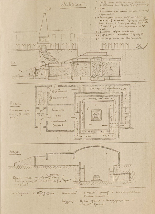 翌日清晨,就必须开始拆除观礼台、开挖陵墓地基与墓穴。在着手绘制陵墓草图前,我邀请了列昂尼德·亚历山大罗维奇·韦斯宁与建筑师安季波夫一同商议陵墓的建筑设计原则。在会议中我提出,陵墓的轮廓不应追求高耸,而应采用阶梯式造型。”