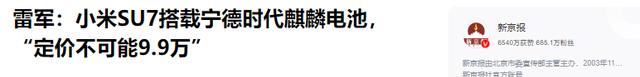原文登载于新京报2023年12月28日关于雷军:小米SU7搭载宁德时代麒麟电池,“定价不可能9.9万”的报道