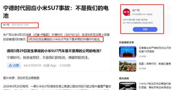 原文登载于红星新闻2025年04月02日关于宁德时代回应爆燃的小米SU7事故:不是我们的电池的报道