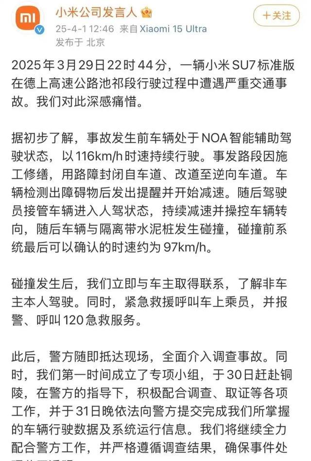 2025年3月29日,安徽铜陵德上高速,一辆小米SU7标准版轿车,直接撞上隔离带水泥桩后迅速起火。