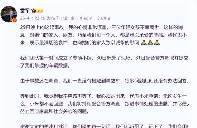 4月1日晚上,面对大家的不满和批评,雷军第一次公开讲话,对不幸遇难的人表示了沉痛的哀悼,他保证小米会全力配合调查,承担应有的责任,不会推卸,不过,这姗姗来迟的声明,并没有让大家消气,仍然存在许多疑问和不信任。