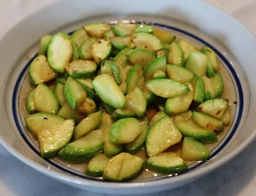 3、第一次炒:热锅凉油,就用花生油或者其他植物油,油热后,放入西葫芦,大火不断翻炒一分钟,用漏勺盛出来,倒掉锅里的水分这一步是为了去除水分