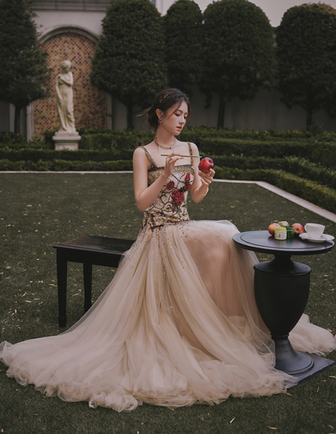 裙摆采用微蓬的A字版型,行走间随风轻扬,既中和了抹胸设计的性感,又增添了几分童话般的灵动气息。搭配简约的低马尾发型与钻石耳饰,李兰迪全程保持着从容优雅的姿态,面对镜头时的浅笑更是让整体造型甜度升级。
