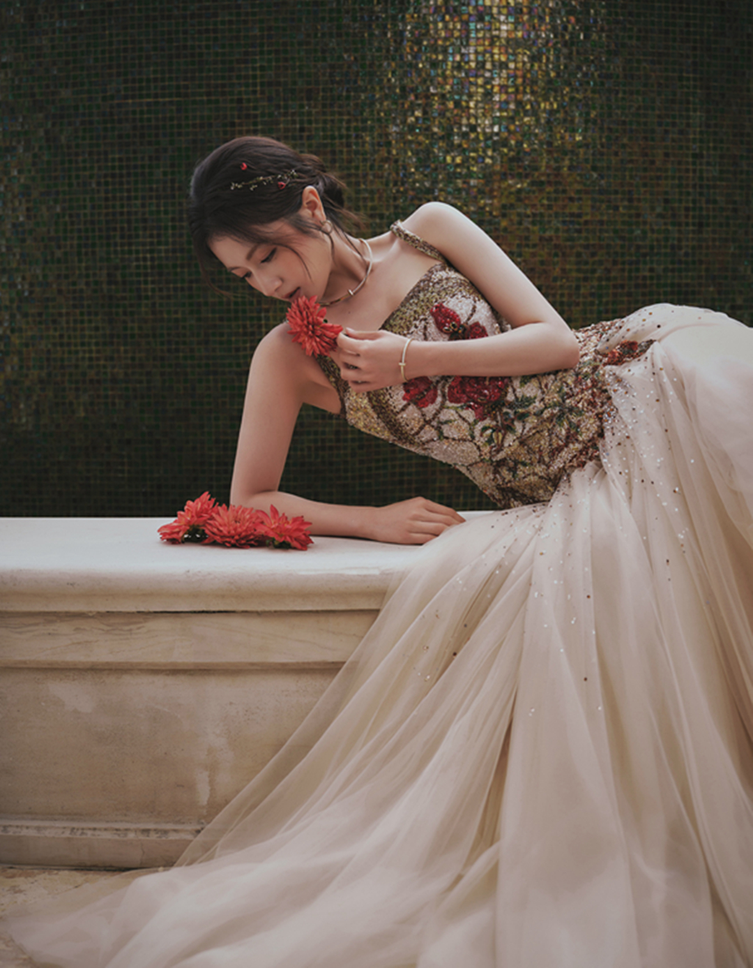 从现场曝光的画面来看,礼裙的设计亮点十足。抹胸款式精准勾勒出李兰迪优美的肩颈线条与精致锁骨,胸前点缀的立体鲜花由粉白两色组成,花瓣边缘镶嵌着细碎的水晶颗粒,在灯光照射下折射出粼粼光泽,与裙摆的亮片刺绣形成呼应,完美诠释了“闪亮”与“鲜花”的核心主题。