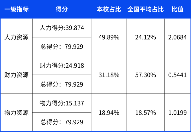 人力资源:权重0.3090。学校当选的“院士”“长江学者”“万人计划”等学术头衔和各类人才称号,拥有的博士生导师、硕士生导师、高级职称教师、非高级职称教师。