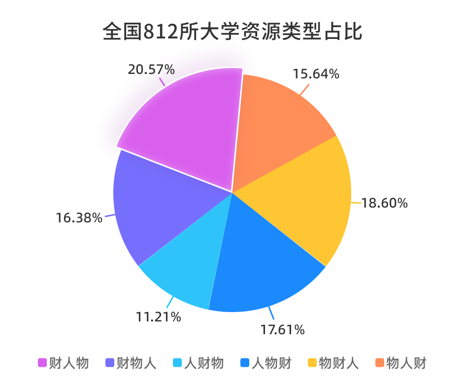 全国812所公办本科大学中资源类型最多的是财人物,共167所,占812所大学的20.57%;最少类型为人财物,共91所,占11.2%。985、211、双一流最多的资源类型都是人物财,分别占78.95%、67.86%、60.71%。