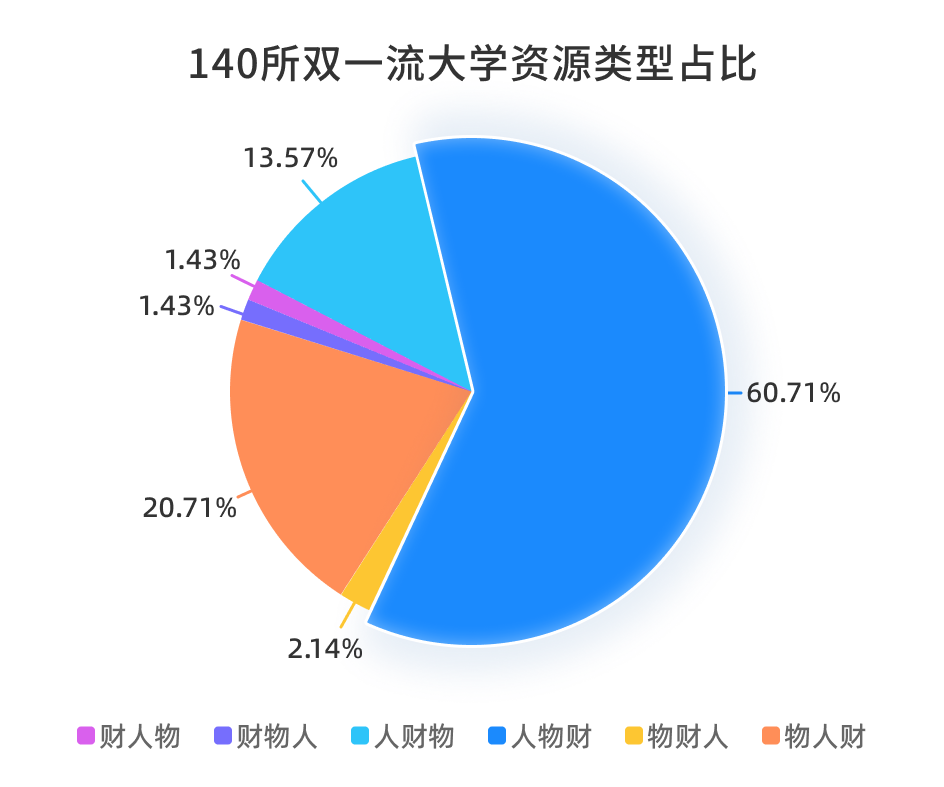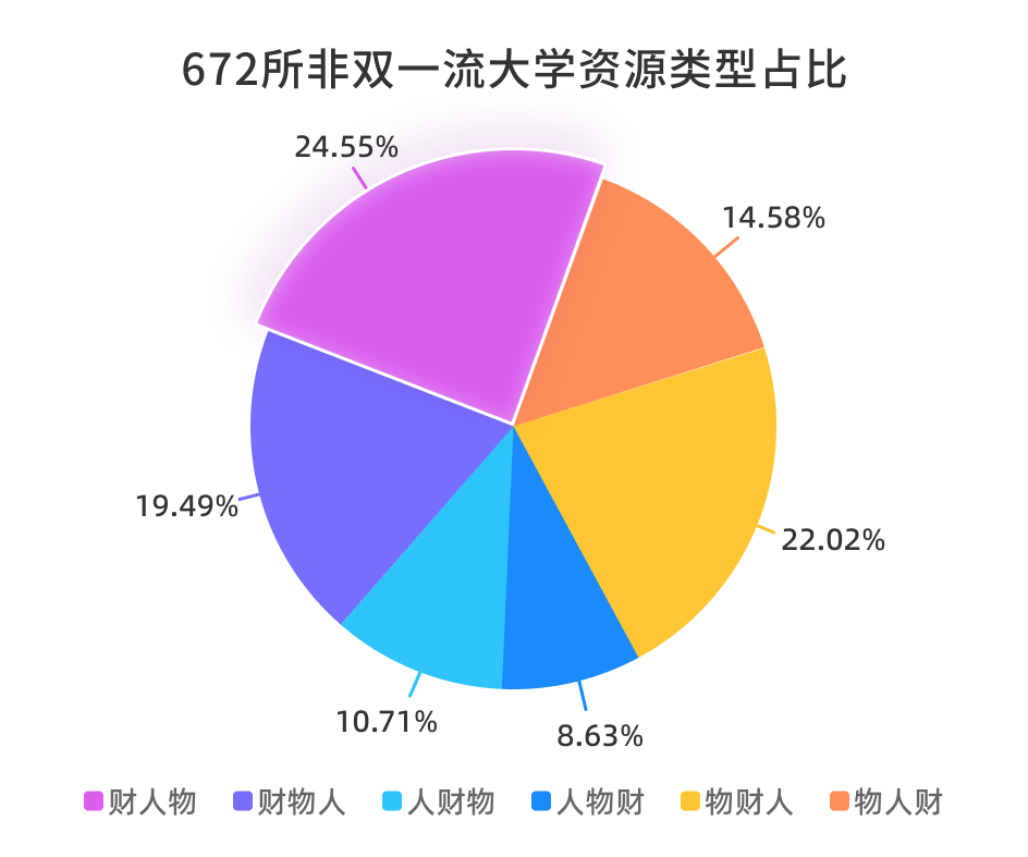 大学资源类型根据人力资源、财力资源、物力资源三项指标在本校的占比、与全国大学平均占比差异确定。分为“人财物”“人物财”“财人物”“财物人”“物人财”“物财人”六种类型。