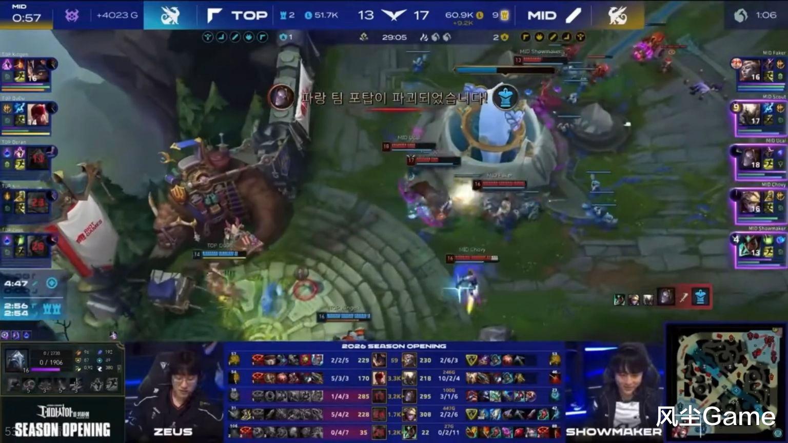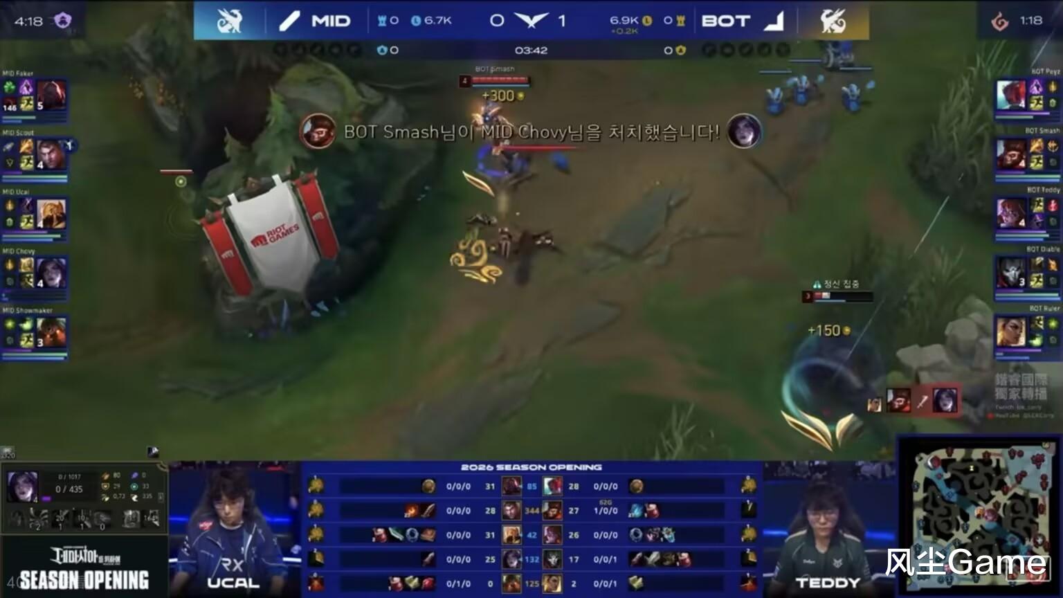 最后一把是中单打AD,这把Chovy被针对惨了,Smash住在下路,开局3分钟就抓死双人组,不过后续的Gank被反蹲了,大超卡莎连拿2个头,扳回前期劣势,打到中期,中单队依旧落后,16分钟人头比13:6,AD队经济领先3.6K,但Chovy这把太猛了,团战疯狂操作,直接带队翻盘了。