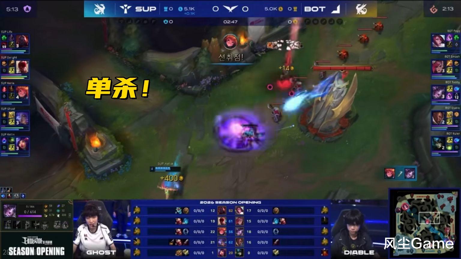Scout节奏起飞,直接把中下路抓崩,比赛22分钟结束,打野队一个正战绩没有,Oner轮子妈最惨,0-9直接超鬼,第二把辅助队,和AD展开较量,开局2分钟,小K在中路单杀Teddy,拿到优势之后,配合打野疯狂游走,又帮下路建立优势,但AD队的韧性很强,中期又靠团战打了回来。