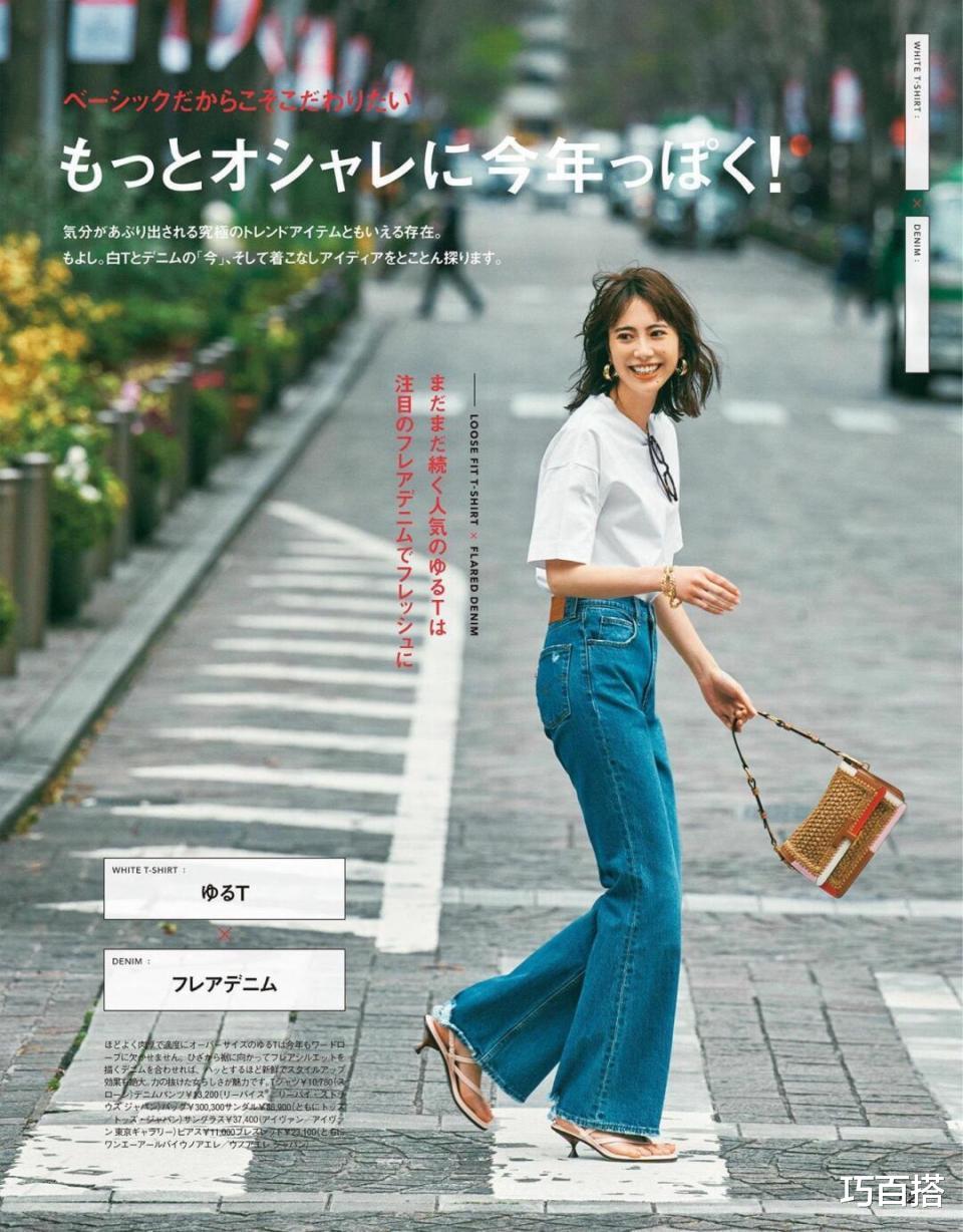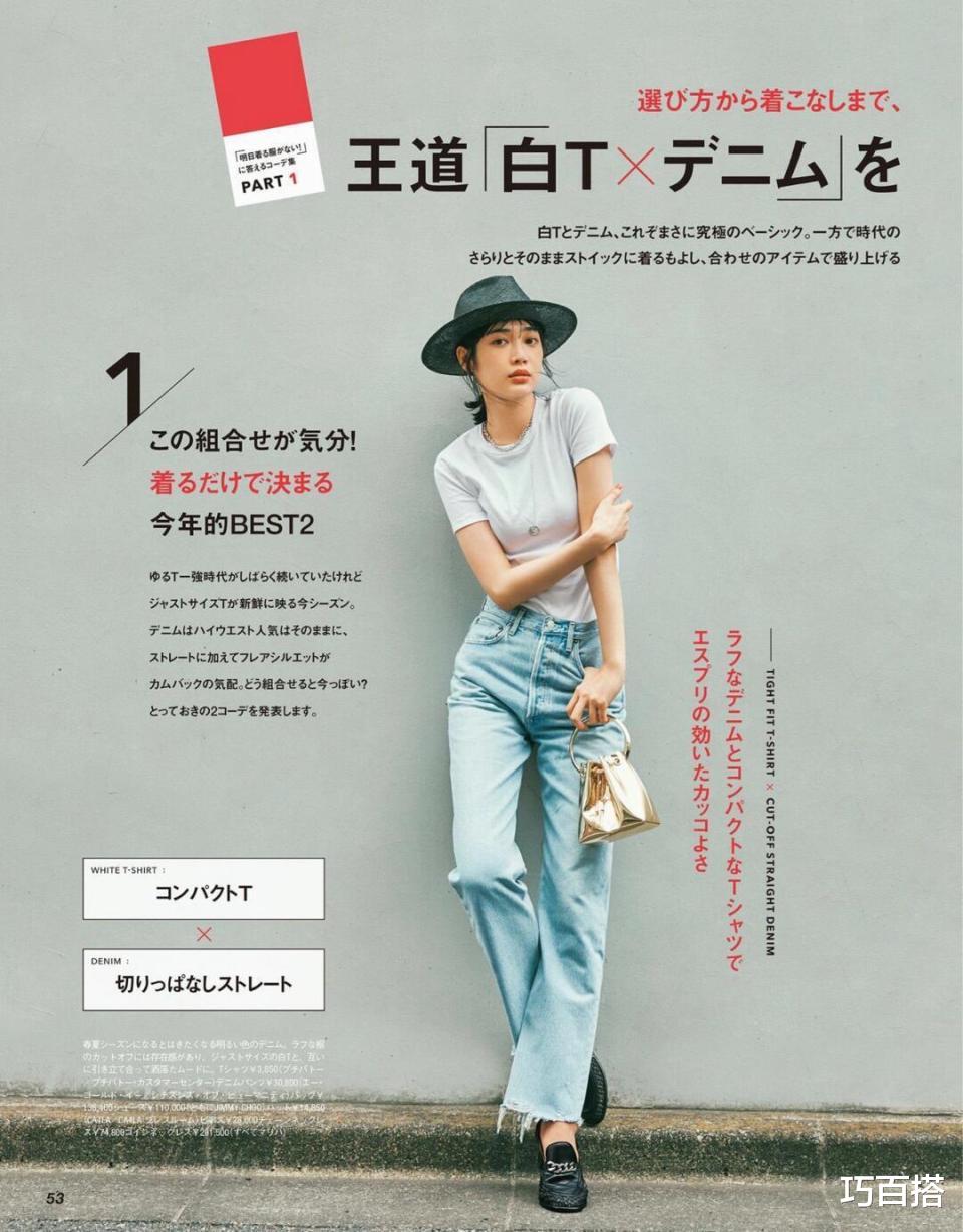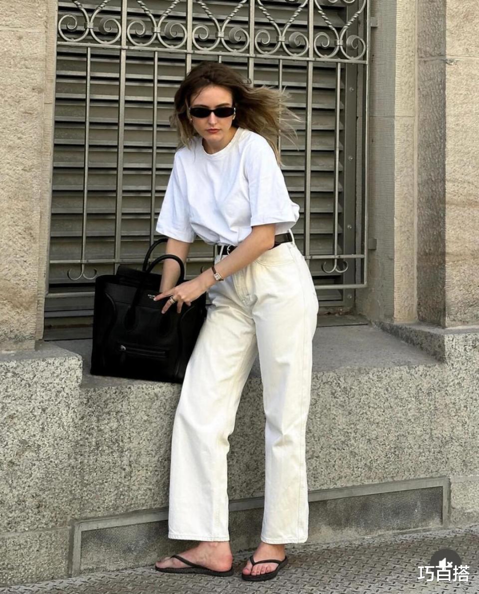 在不会暴露身材瑕疵的情况下,既把白色T恤和奶茶色直筒牛仔裤穿出了高级美感,又把身材比例优化到了极致,干净利索!
