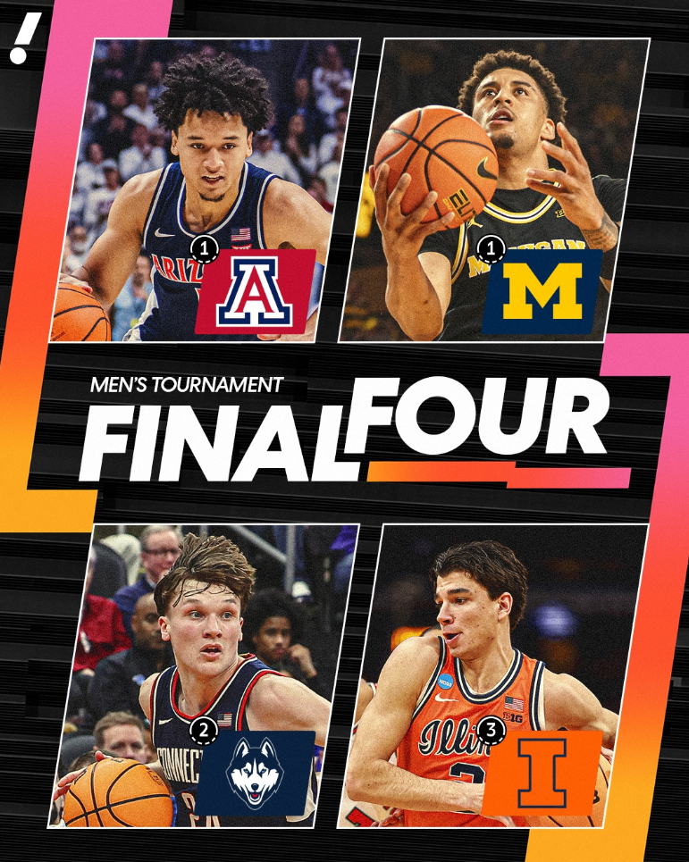 今天上午,NCAA精英八强赛落下帷幕,终极四强名单正式出炉,康涅狄格大学、密歇根大学、亚利桑那大学和伊利诺伊大学成功突围,四支球队将向着冠军奖杯发起最后的冲击。