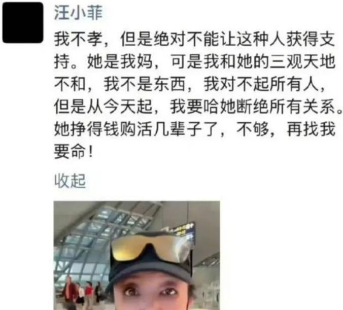 这条朋友圈的信息量非常大。接着,审视所附图片,其展示的是张兰的不雅形象(一只眼较大而另一只较小),这似乎揭示了汪小菲当时对张兰持有强烈的偏见。进而,汪小菲所选用的表述“此类个体”彰显了其于当下情境中对“此类个体”持有贬低态度。此外,汪小菲在其社交平台的动态中提到,张兰的财富足以支撑多世生活,这暗示当前张兰财务充裕,并非资金匮乏。然而,她仍然利用已故人士的影响力牟利,实际上,汪小菲的此番言论意指张兰贪婪成性,永不知足。此外,汪小菲进一步指出,尽管张兰积累了丰厚的财富,但她似乎仍感不满,甚至试图向汪小菲索求更多,这表明汪小菲可能长期处于财务支配之下,一直被视为母亲的宠儿,始终无法摆脱张兰的影响与操控。事实上,汪小菲标榜“不孝”之举同时公开与张兰决裂,其深层动机或许在于巧妙地剥离母亲身上的“纷争曝光”,以此保障自身的利益。张兰通过利用热门话题进行商品推广(比如借助大S离婚事件和汪小菲的传闻),虽屡次引起广泛关注,却也已开始损害汪小菲的公众形象。因此,汪小菲此番激烈反应,其目的或许旨在摆脱“张兰儿子”的身份烙印,力图构建一个独立自主的商业品牌标识。