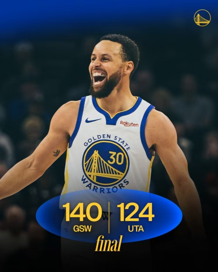 1月29日, NBA常规赛战火燃情正盛,金州勇士携季后赛突围之志,奔赴客场迎战犹他爵士。赛前战局已然分明:勇士以26胜22负稳居西部第八的位置,正全力攥紧季后赛入场券;爵士则以15胜32负深陷西部第十三的泥沼,尚在重建之路上步履蹒跚,纵使斗志未减,硬实力与勇士相较仍有不小差距。本场对决,勇士双核库里与格林联袂首发,前者以一场里程碑式的惊艳表现扛起进攻大旗,后者则在战术幕后默默耕耘、无私奉献,二人一攻一防、一核一轴,相辅相成间引领勇士以140-124的悬殊比分酣畅大胜爵士,为季后赛征程再添浓墨重彩的一笔。