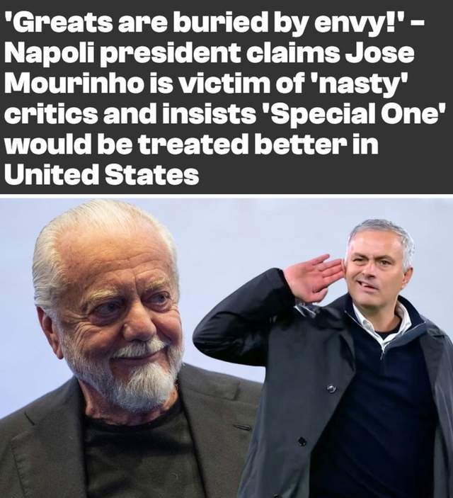 GOAL网站报道,那不勒斯主席德劳伦蒂斯为本菲卡主帅穆里尼奥进行了辩护。德佬坦言,在欧洲足坛,原本是伟大胜利者的穆里尼奥,被妒忌埋没了,如果穆帅在美国,那他就是大英雄。