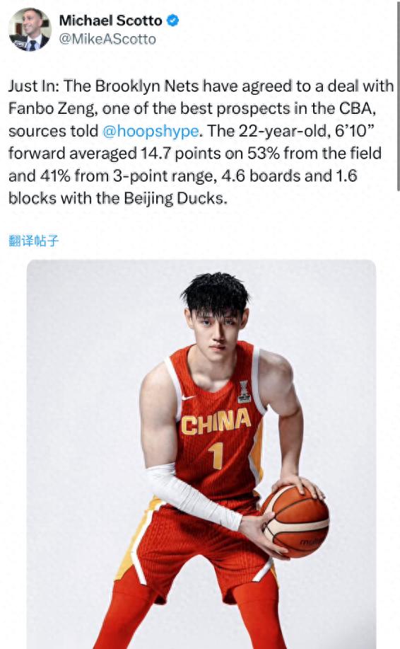 果不其然,在今天早些时候,根据HoopsHype记者Michael Scotto报道,NBA篮网队和中国男篮球员曾凡博签下了一份合同。