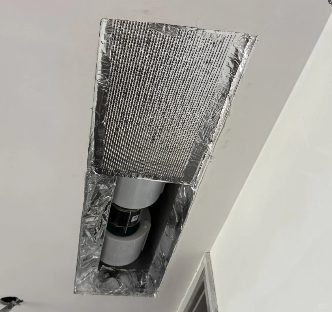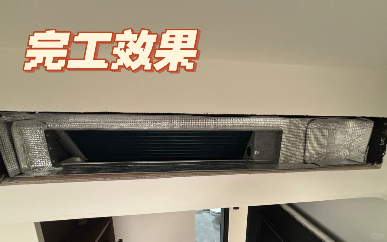 在出风口盖板安装之前,可以用铝箔胶带粘在裸露的石膏板切面上,这样就可以包裹露出来的玻璃纤维了。