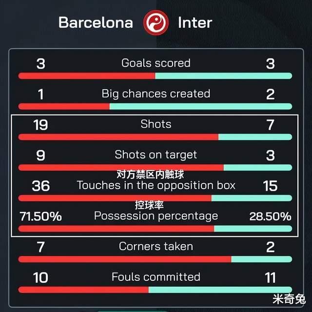 两回合甚至用的都像是同一个剧本,国米两场都是抢开局成功,打出一个2比0领先。随后巴萨拿回控球权和进攻主导权,慢慢破开国米的铁桶阵。从首回合统计数据也能看到,巴萨控球率高达71.5%,在对方禁区内触球次数是国米的2.4倍,射正数9比3,但是国米的射正全部收获进球。